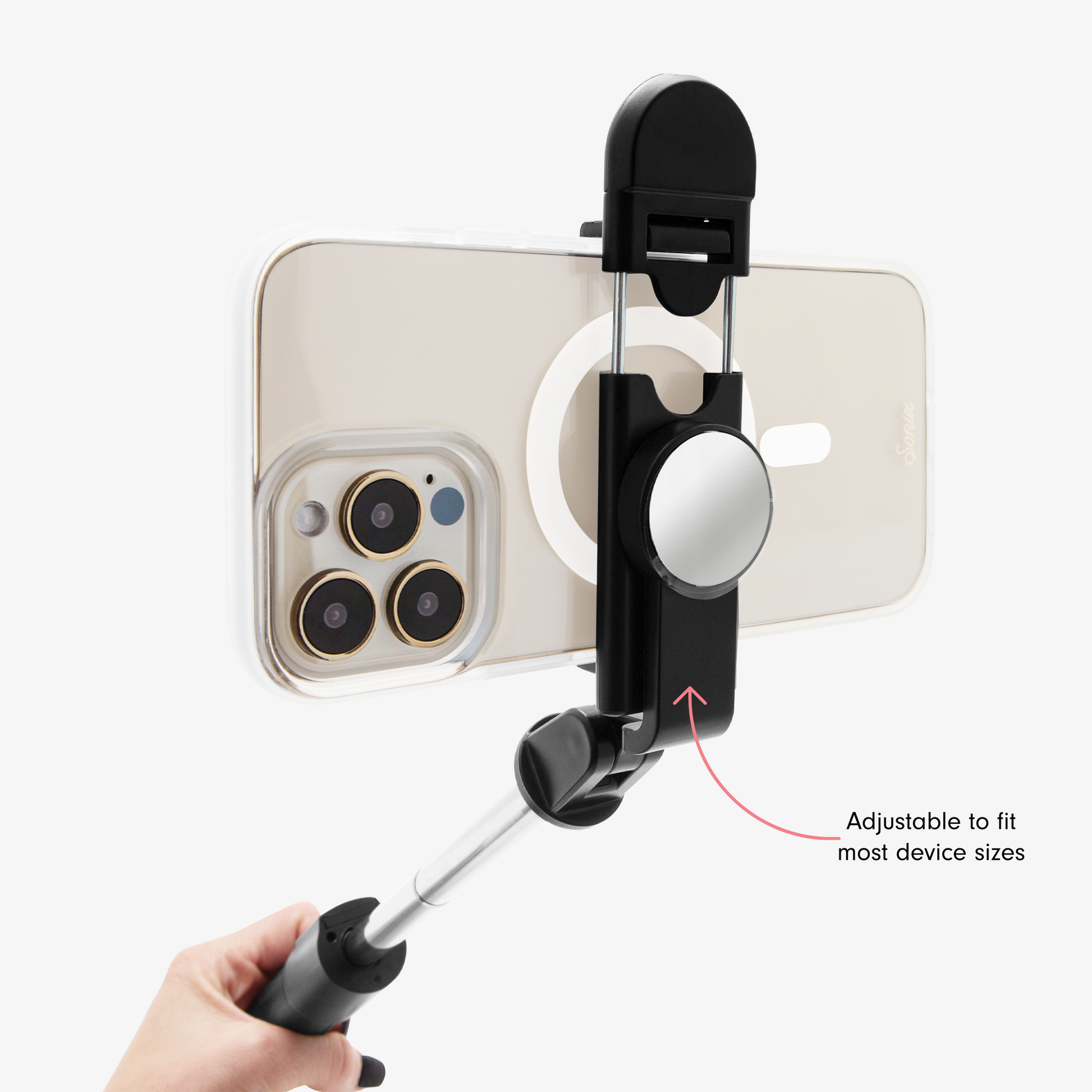 2. Secure your device into the device holder at the top of the selfie stick - flip out the clamps and insert your phone!