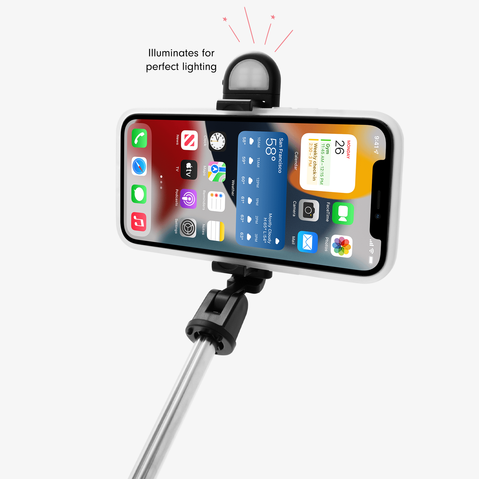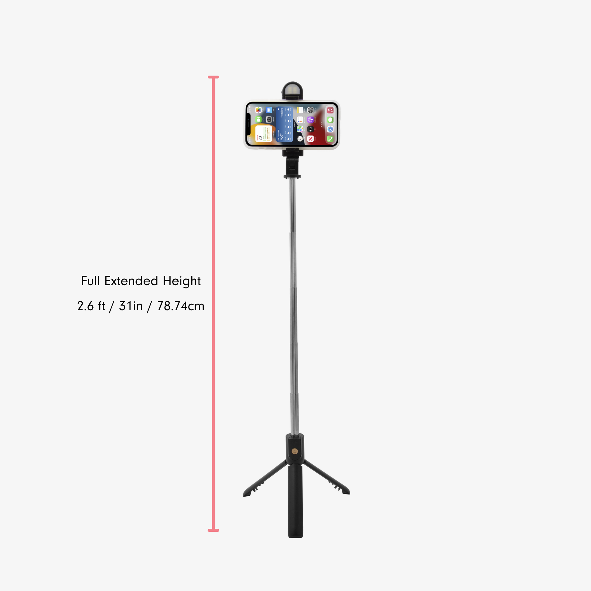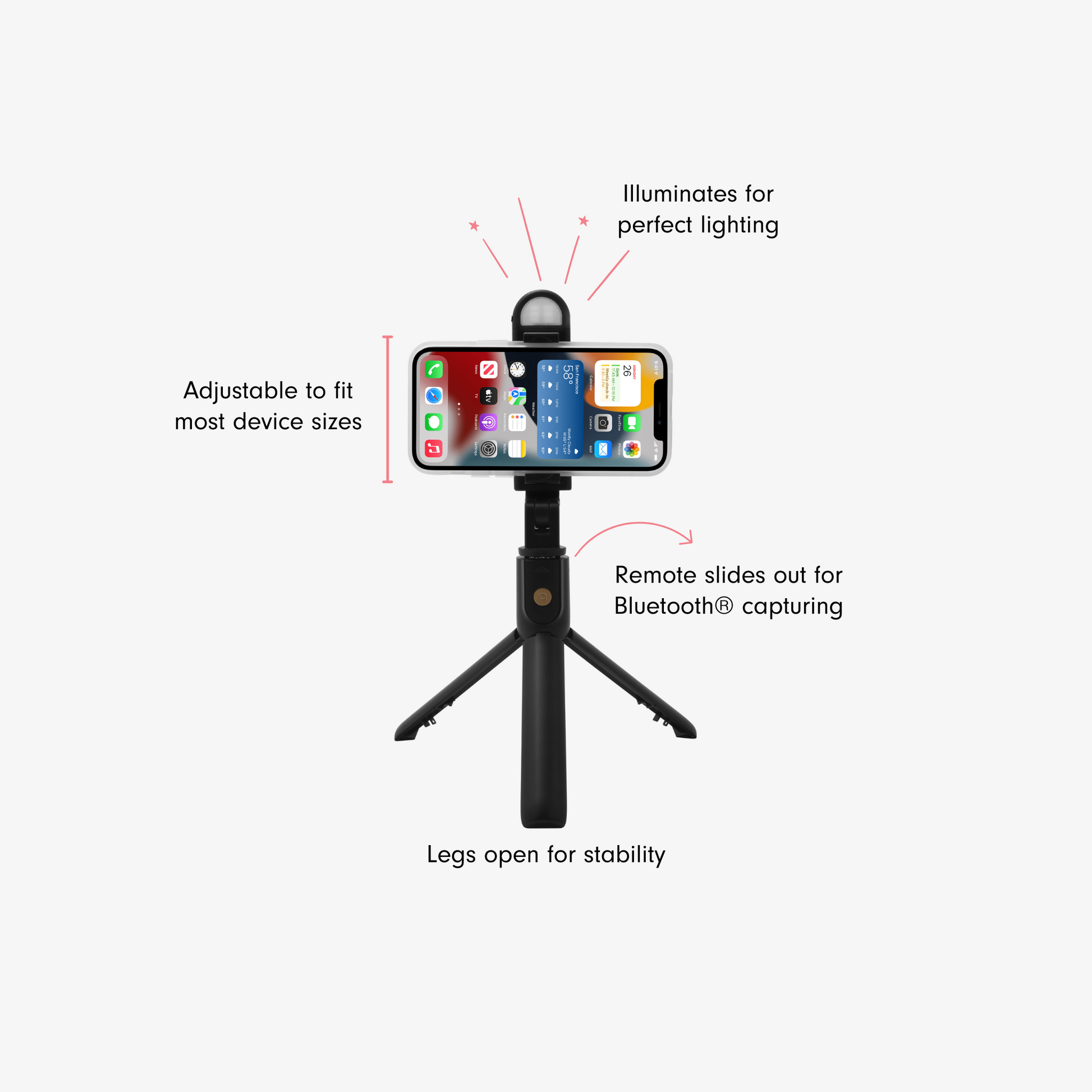 Elevate your vacation pics with this selfie stick that doubles as a tripod! Our new selfie stick can hold various sized devices, has a Bluetooth remote for wireless capturing, and has a light on the top to help illuminate your shot. Done taking selfies and need group pics from the house party? We’ve got you - unfold the legs at the end to convert it into a tripod.
