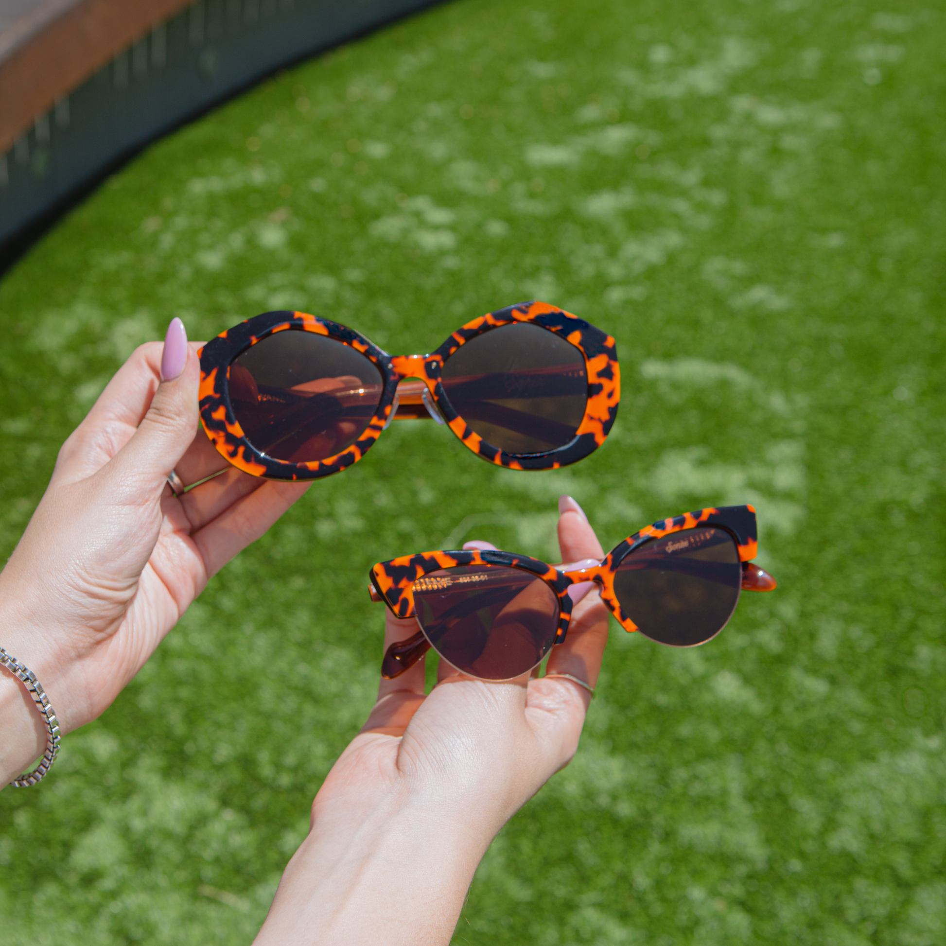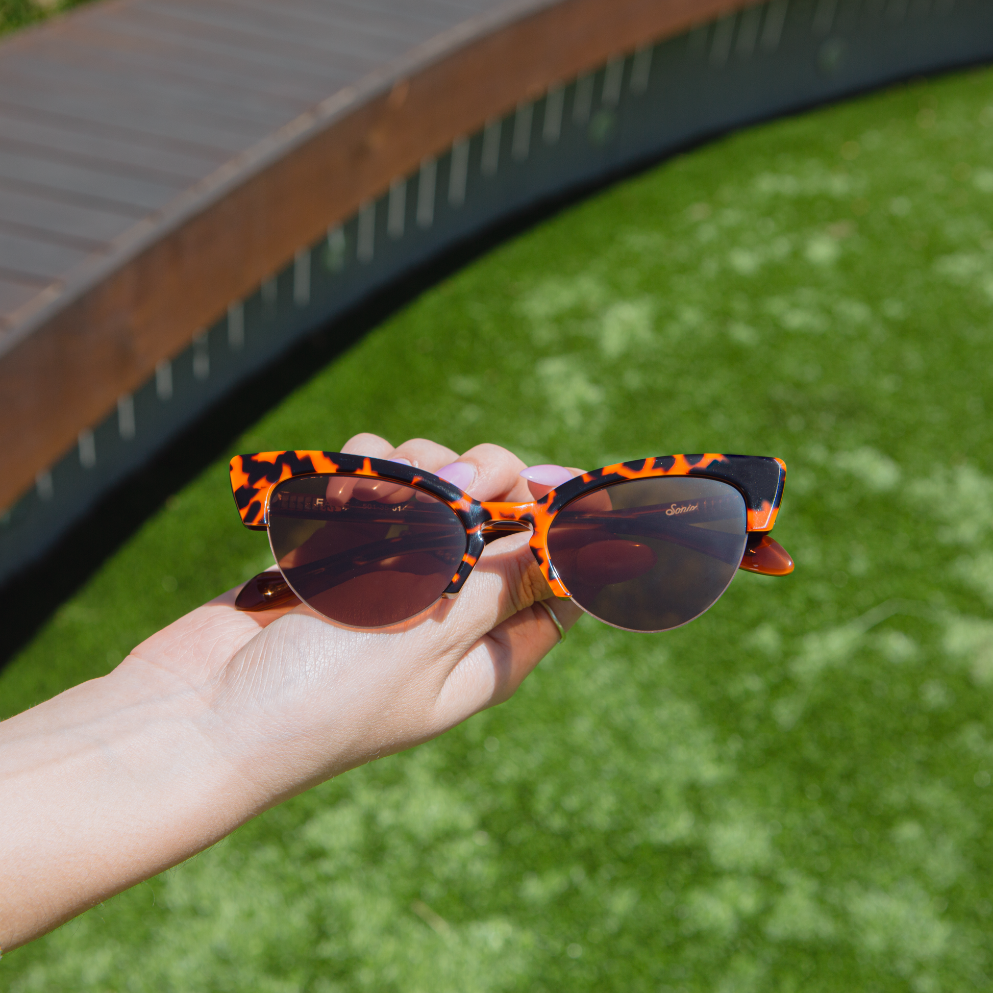 Not your mom’s typical cat eye. Our Faye sunglasses put a modern spin on the cat eye featuring a 50-50 frame design and in our favorite print, Brown Tort.